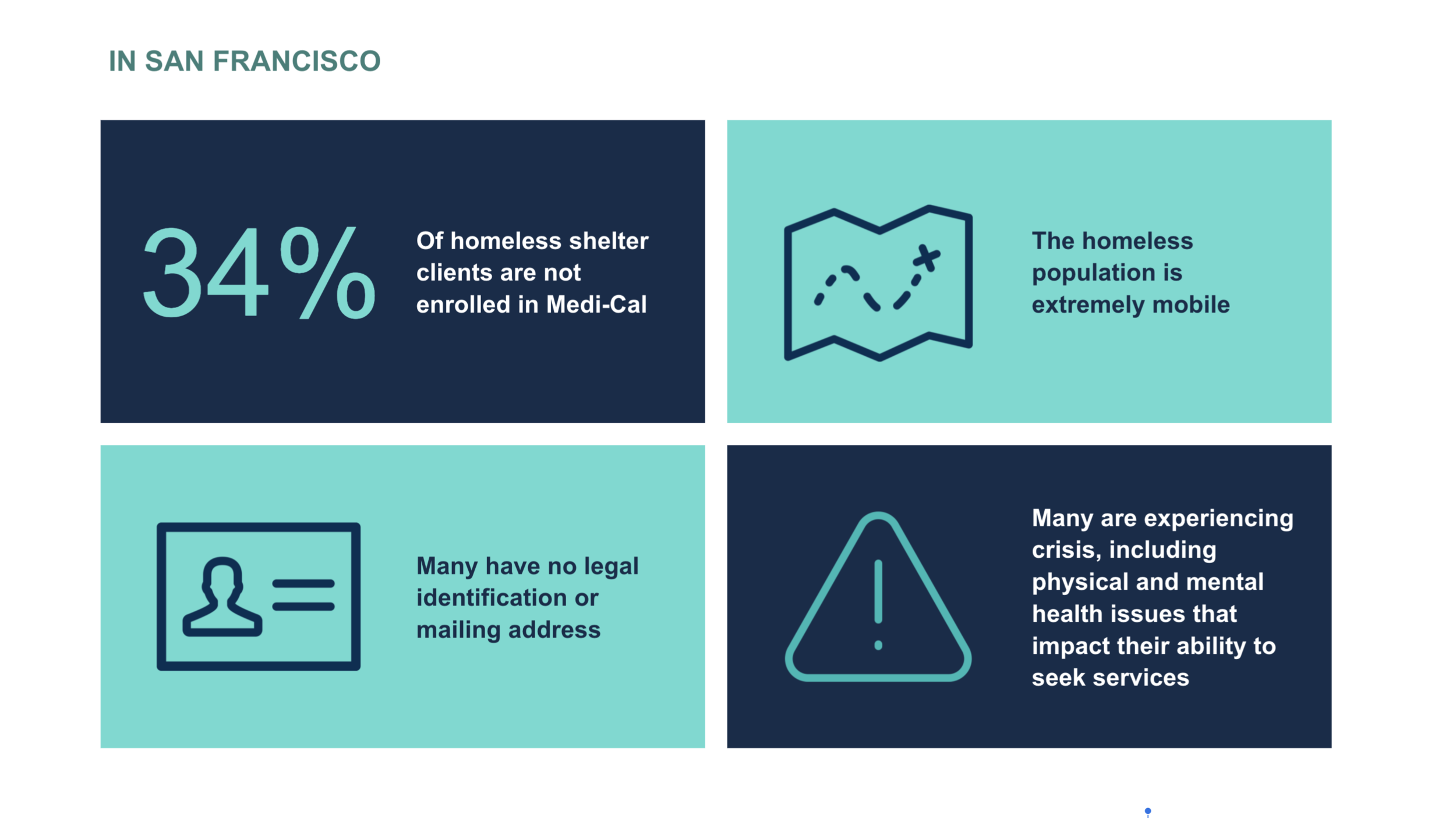 To improve access to services the program led the design and implementation of citywide care coordination software, planned for SF’s transition to CalAIM, a state-wide Medi-Cal program, and helped design services for “Mental Health SF”, an overhaul of San Francisco’s mental health system for residents lacking insurance or experiencing homelessness.
