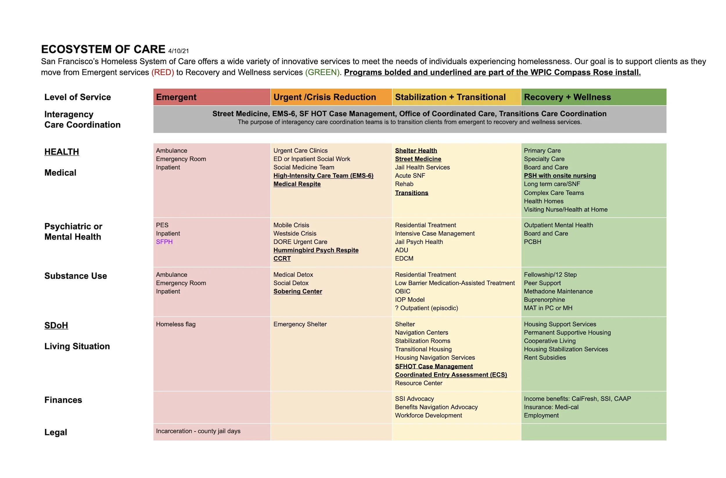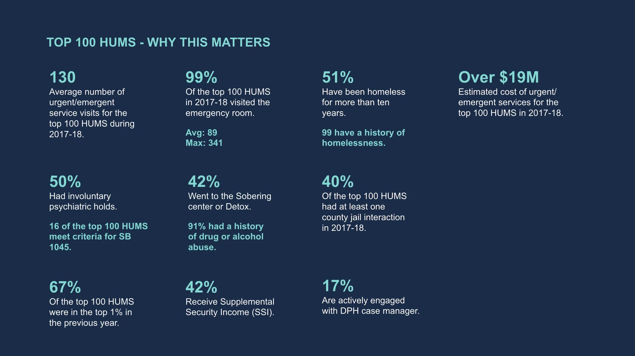 Improve health outcomes for adults experiencing homelessness in San Francisco through better coordination, collaboration, and data sharing across City programs and services.